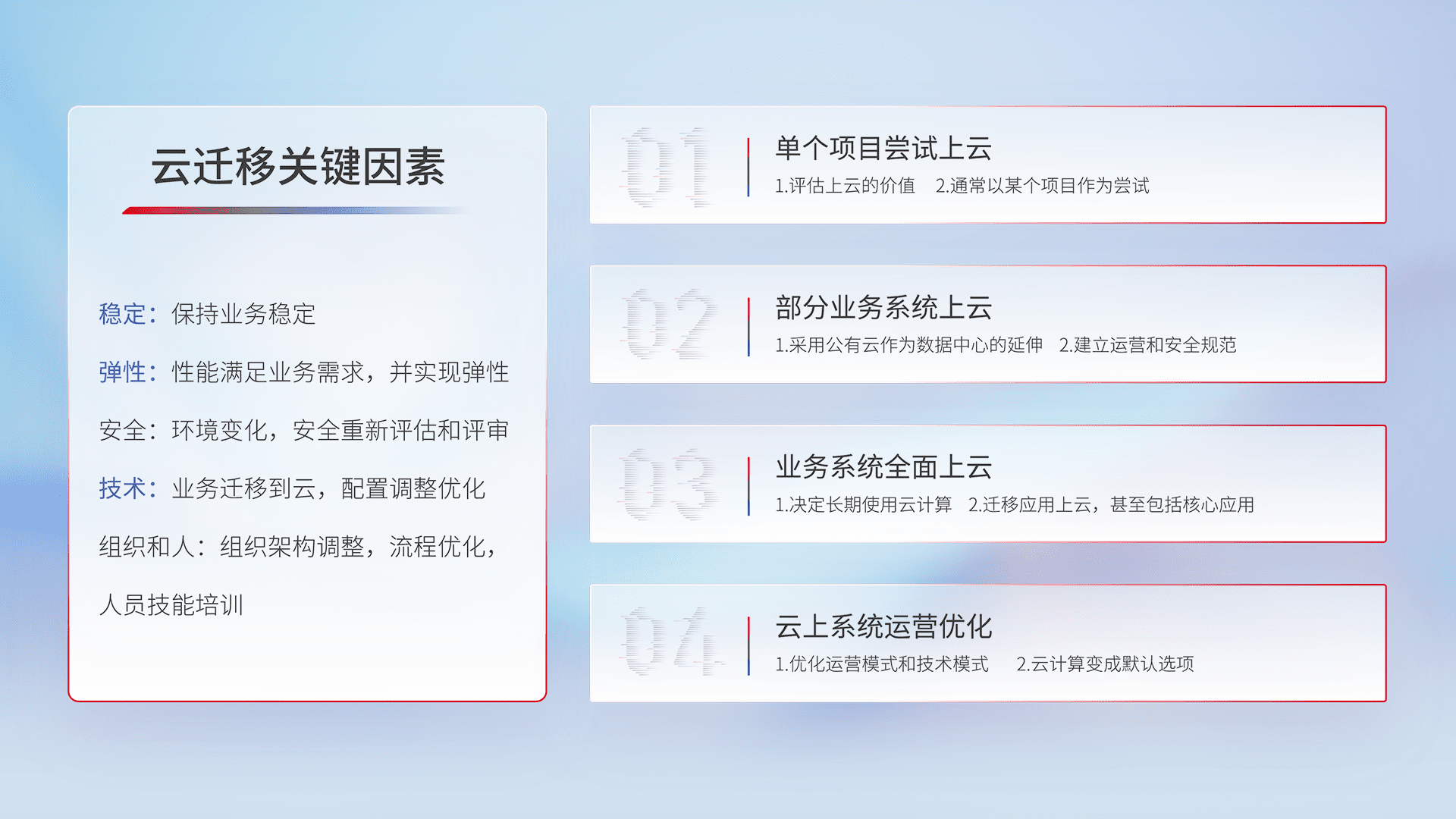 结合实际业务,,,,从规划设计、、云平台选型、、云原生改造、、、、数据迁移、、集成交付,,,,迁移全过程为客户识别最佳上云路径,,,,做好风险识别管理,,,,设计网络架构、、身份权限、、、安全审计合规、、、、操作审计、、日志审计、、监控告警策略、、、、多站点容灾设计等,,对云上基础设施进行整体规划,,提升IT治理水平,,,以满足弹性、、、高可用、、高性能的需求。。。。