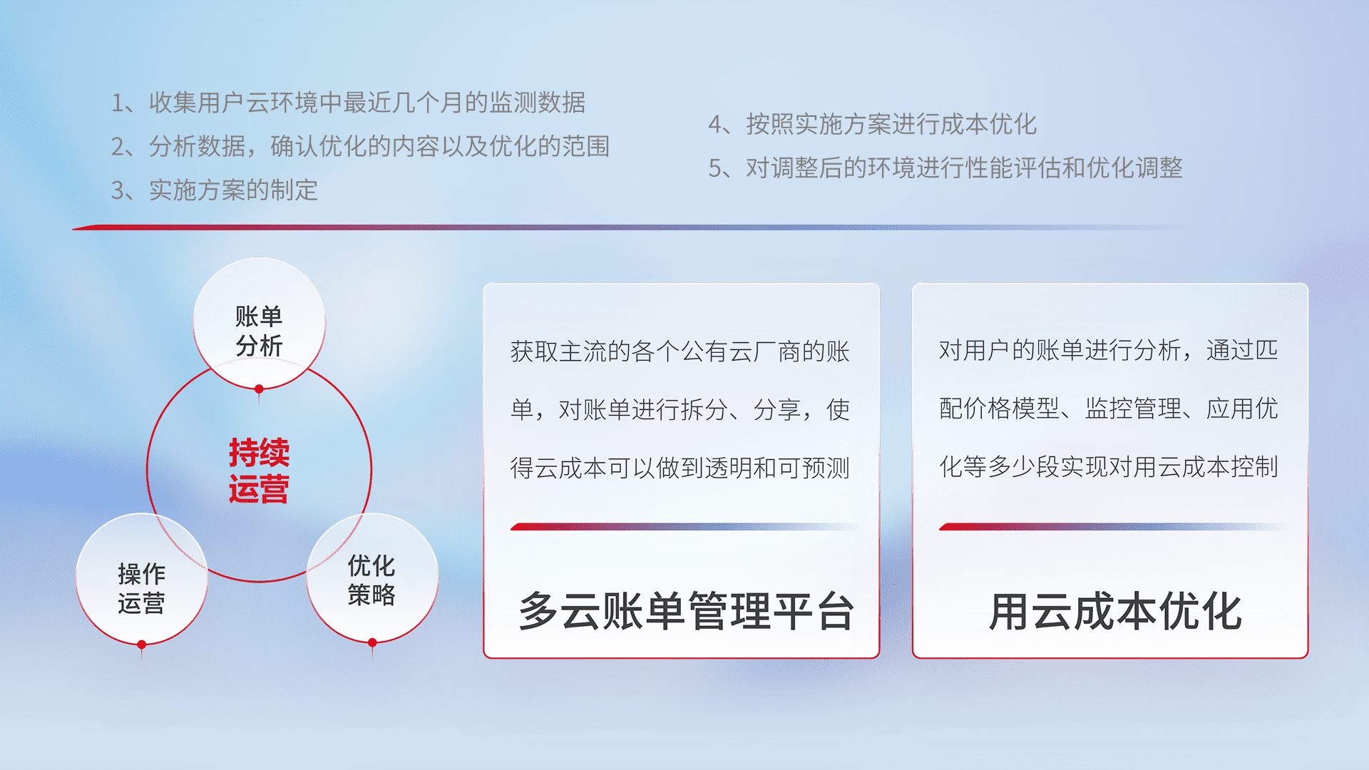 通过多云纳管,,以统一的资源数据模型把客户的云资源进行抽象和封装,,,进而实现对多云资源的统一操作,,,保障云资源管理的可靠性、、、稳定性与可用性。。。量身定制化运维内容,,,,配置、、开发运维、、补丁管理、、、备份、、、监控、、、、认证和访问管理、、、、审计和日常巡检等,,,,保障在用云过程中的可靠度,,稳定度以及高可用率。。
