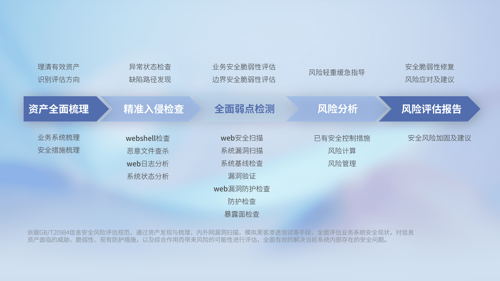 针对客户行业特性,,,,以专业的安全服务+多厂商联合解决方案提供专属的一站式安全管理服务,,帮助客户全面感知网络空间威胁,,,基于识别、、、、检测、、、、分析、、、、防护、、、监测、、响应的服务理论模型,,从方案咨询、、、集成交付、、评估验证、、、、优化加固、、、运维运营,,致力于为客户提供完整的闭环管理式安全服务。。以实战经验为客户打造高抵御风险的安全体系,,,帮助客户发现威胁、、、对抗威胁、、、、处置威胁,,,不断积累安全对抗能力,,,持续保障数字化安全。。。